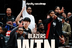 赛后,开拓者官方分享本场比赛赢球海报,镜头给到庆祝时的替补席,杨瀚森和利拉德入镜。