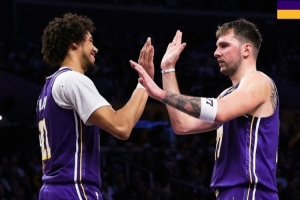 赛后湖人官方晒出本场赢球海报,东契奇和海斯击掌照登上封面。