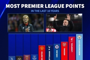 近10年英超总积分排名:
