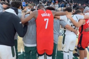 GIF-赛后杜兰特和谢泼德“加入”雄鹿祈祷圈