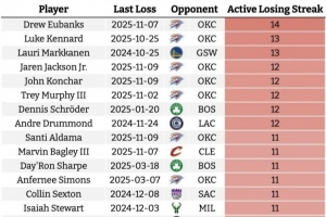 现役球员面对一支球队的连败榜,尤班克斯对雷霆14连败第一,威少对森林狼10连败,5天后双方再度交手