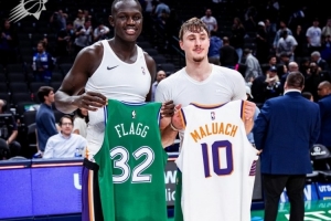 赛后,独行侠状元秀弗拉格和太阳首轮10号秀马卢阿奇交换球衣。