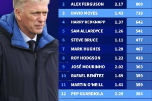 英超主帅执教场次排名:莫耶斯728场第三,有望追上弗爵爷和温格