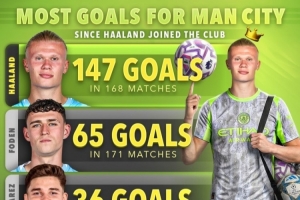 体育资讯12月15日讯 自从哈兰德加盟曼城以来,他的恐怖进球效率已经不断刷新多项纪录。据score90数据统计,2022年夏天,自哈兰德加盟曼城以来,球队的射手榜单中,哈兰德本人以168场打进147球断层领跑,福登以171场打进65球排名第二。