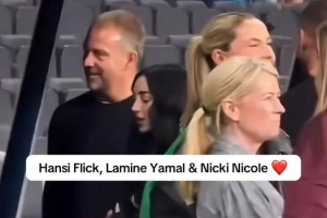 亚马尔的女友妮基-妮可来到现场,为男友助威,巴萨主帅弗里克赛后与亚马尔、妮基-妮可交谈,三人都面带笑容。
