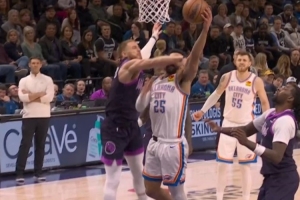 GIF-阿杰伊·米切尔突破上篮被迪文岑佐一巴掌扇脸上